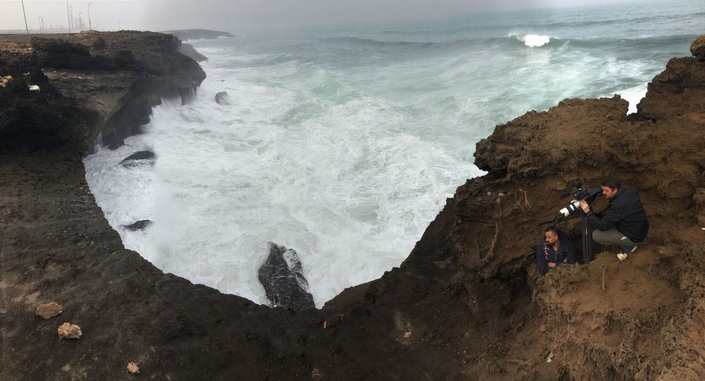 Tournage au coeur de la ville et en bord de mer. Les histoires se nourrissent de ces plans hors contexte. Le drone d’Abdelmounim nous procure une autre vision de la ville blanche tandis que Thomas et Tiga se confrontent au plus près à la force des éléments.