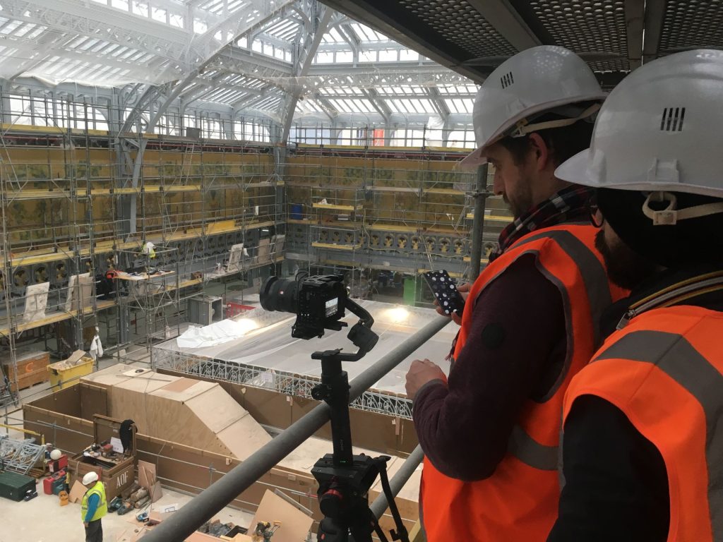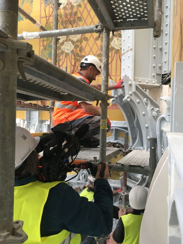 Contorsion sur les échafaudages pour filmer la repose des corbeaux de l‘ancien grand magasin de la Samaritaine à Paris.
