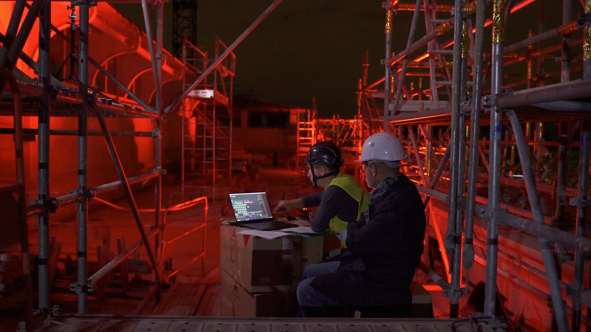 Tournage des essais du plasticien lumière Franck Franjou. Beaucoup de patience, de la finesse et de la précision pour parvenir à une scénographie lumineuse réussie pour la Samaritaine.
