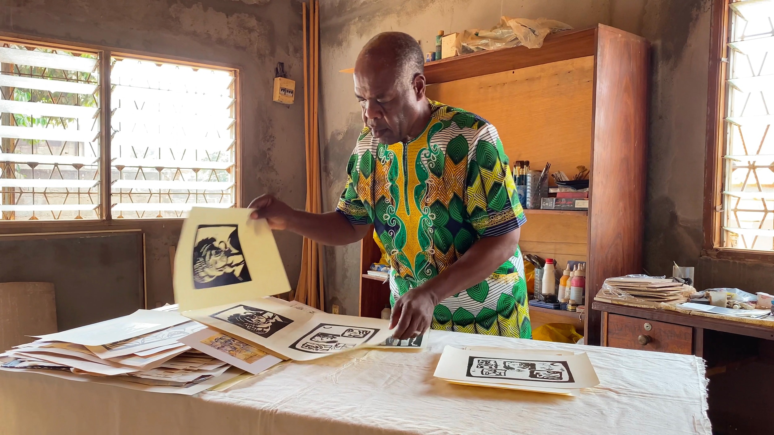 Rencontre et portrait du peintre René Tchébétchou, chez lui, à Yaoundé, au Cameroun.